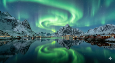 "极高画质风光摄影,挪威罗弗敦群岛的夜晚,绚丽的绿色极光在空中舞动,倒映在平静的湖面上。雪山背景,画面纯净,冷色调,长时间曝光。"