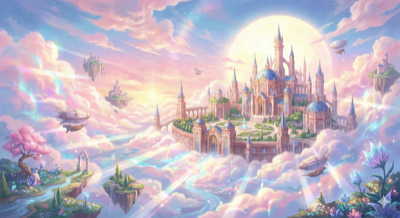 "唯美奇幻画风,漂浮在云端的天空之城,粉色和蓝色的梦幻晚霞。柔和的粉彩调,流光溢彩的云朵,光芒万丈,宫廷式建筑细节,充满史诗感。"