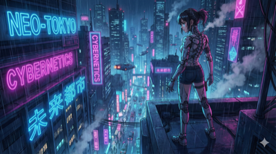"赛博朋克风格动漫,一位带有精致机械义体的少女,背景是繁华的霓虹灯夜景都市。大量青色与品红色的灯光交织,高对比度,电影级光效,细节丰富的机械结构,4k分辨率。"
