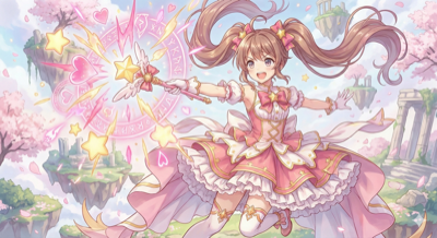 "华丽的日系动漫风格,魔法少女正在施法。粉色与金色的特效光芒,飘逸的裙摆,可爱的表情,星星和丝带装饰,充满活力,京都动画风格。"