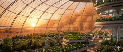 "写实主义风格,未来火星殖民基地,巨大的玻璃穹顶内部。窗外是荒凉的红色沙尘地表,室内是高科技温室植物。广角镜头,夕阳透过稀薄大气射入,电影级写实。"