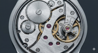 "微距摄影,机械表芯内部结构。精密的齿轮与发条咬合,拉丝金属材质与宝石轴承。极简构图,深灰色背景,高冷色调,强调工业之美。"