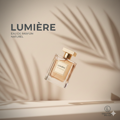 "极简主义产品摄影,一只悬浮在空中的高档香水瓶。柔和的米色背景,自然光影,植物阴影投射在墙上,高级感,杂志排版风格。"