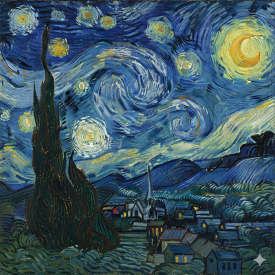 "印象派油画风格,模仿梵高《星月夜》。旋涡状的深蓝色天空,明亮的黄色星星,流动的笔触,厚涂颜料质感,充满情感的表达。"