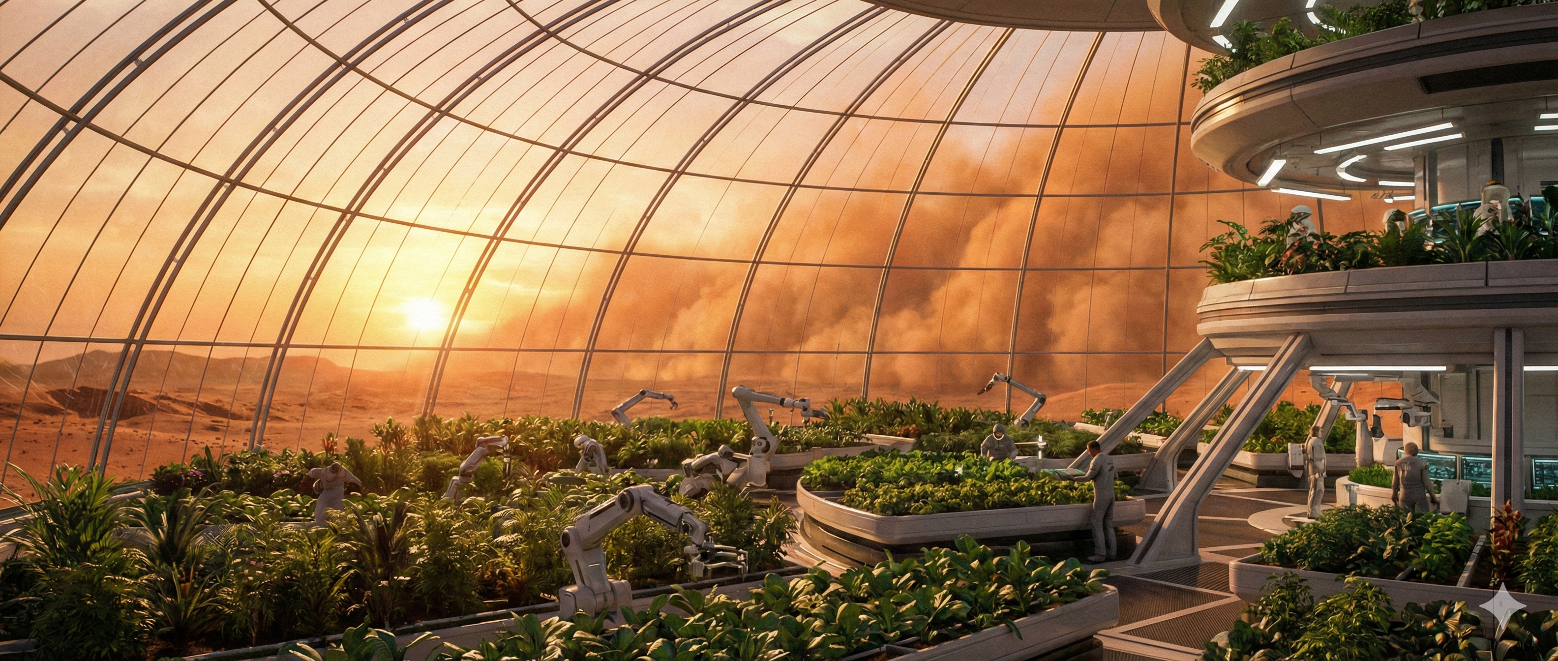 写实主义风格,未来火星殖民基地,巨大的玻璃穹顶内部。窗外是荒凉的红色沙尘地表,室内是高科技温室植物。广角镜头,夕阳透过稀薄大气射入,电影级写实。